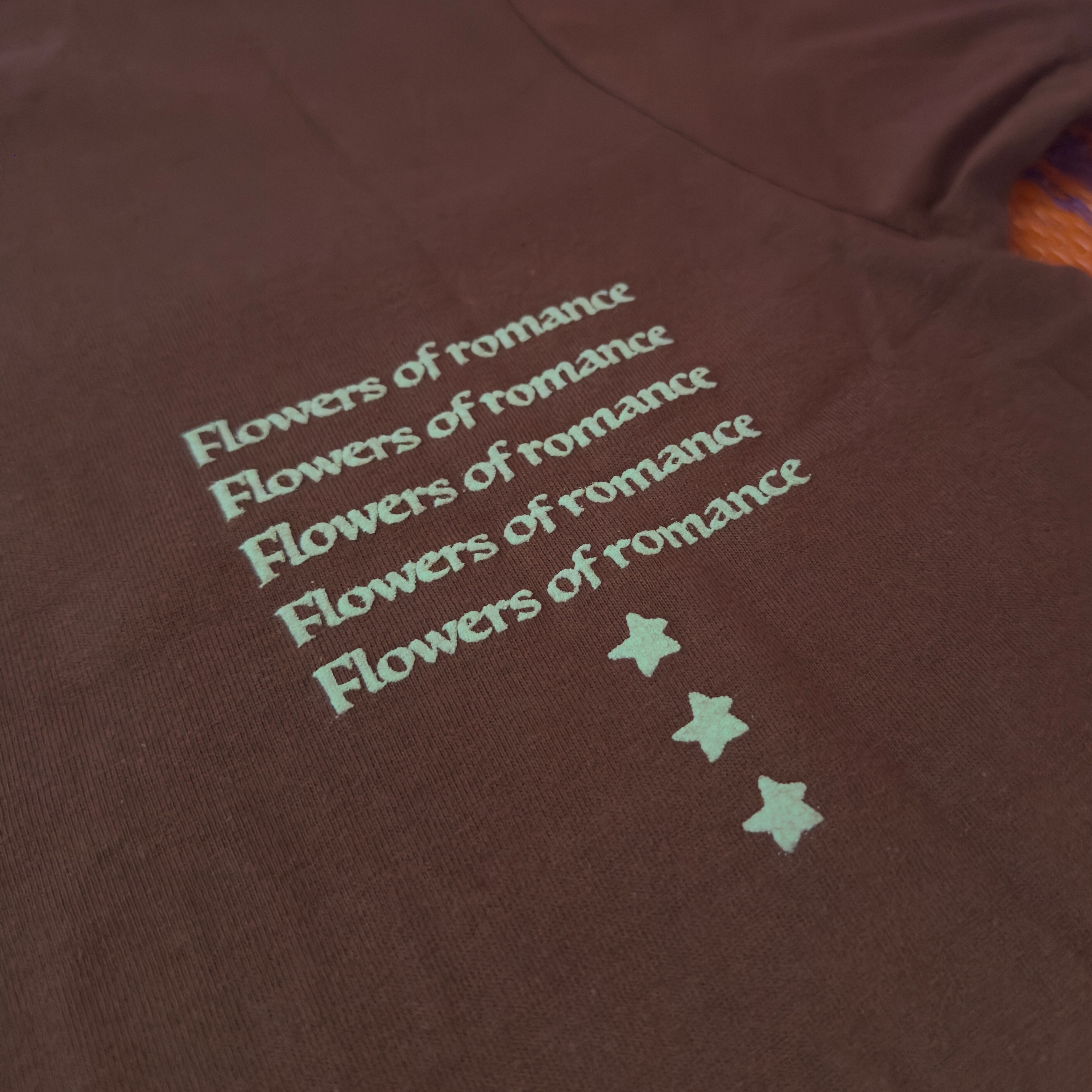 Flowers of Romanceの文字がフロント、バック両面にシルクスクリーンでプリントされたT-shirtです。